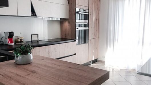 Il primo piano è stato allestito con elementi Aran, sia per la cucina che per il soggiorno, allo scopo di marcare una continuità spaziale che già si era strutturata con la demolizione di parte della parete che chiudeva la cucina. Il colore del legno, in contrasto con il grigio scuro, l’uso di un bianco materico per i pensili alti e l’alternanza di tagli negli stessi pensili, contribuiscono a generare un ambiente accogliente e non troppo freddo.