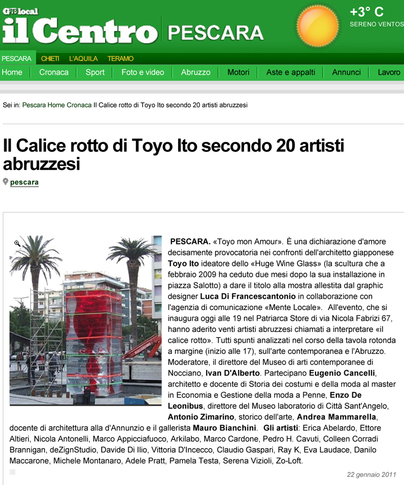 Evento ideato da Luca Di Francescantonio come momento di riflessione sulla scultura di Toyo Ito in piazza Salotto a Pescara attraverso le interpretazioni del calice rotto ad opera di una selezione di creativi locali.